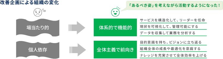 課題解決に向けて同事業所は、改善活動を2段階で進める方針を定めました。ステップ1では、情報システム部門のあるべき姿や課題の整理、メンバーの意識改革に着手。そのうえでステップ2として具体的な施策を実行するという方針です。