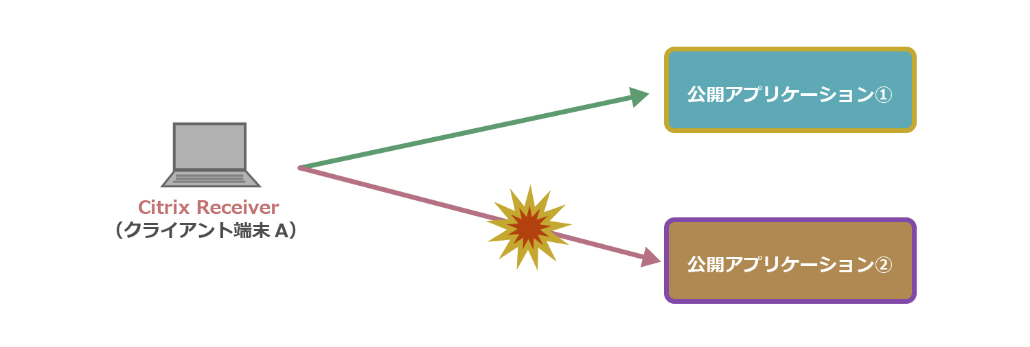 上図のように「クライアント端末B」のみで公開アプリケーション起動ができない場合、「クライアント端末B」に原因がある可能性があります。このような状況の場合、問題が発生するクライアント端末で、以下の差異がないかをご確認ください。