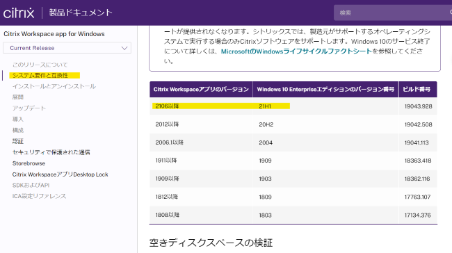 7.以下の表にて、Workspace app の各バージョンのWindows 10対応バージョンが確認できます。Workspace app 2106以降は Windows 10 21H1に対応していることが確認できます。
