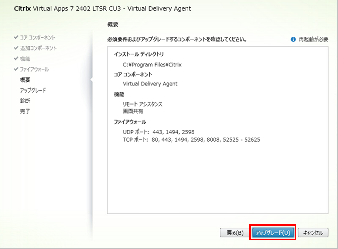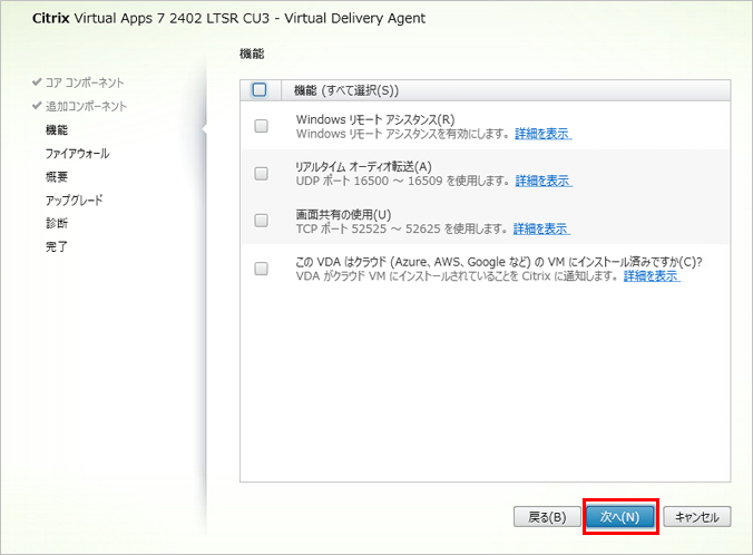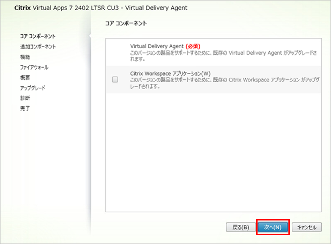 ※Citrix Virtual Apps and Desktops 7 2203のインストール時に追加した機能(コンポーネント)はそのまま引き継がれます。アップグレード時に新規に追加したい機能(コンポーネント)があれば選択してください。
