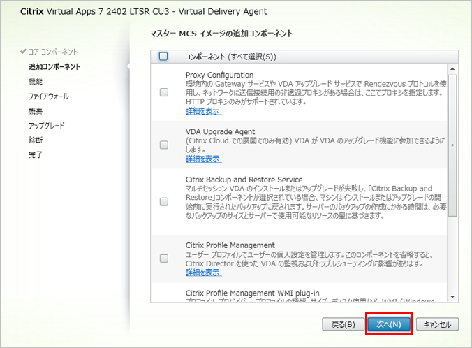 ※Citrix Virtual Apps and Desktops 7 2203のインストール時に追加したコンポーネントはそのまま引き継がれます。アップグレード時に新規に追加したいコンポーネントがあれば選択してください。
