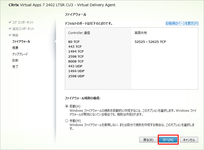 6. 「ファイアウォール規則の構成」にて「自動」もしくは「手動」を選択後、「次へ」をクリックします。