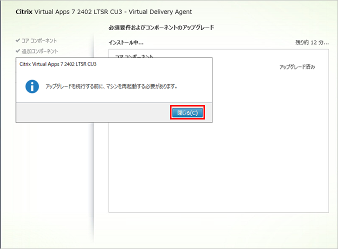 9. アップグレード中、下記の画面が表示された場合は「閉じる」をクリックします。