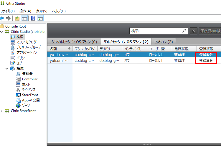 「登録状態」列にて、VDAサーバーが「登録済み」にて表示されていることを確認します。