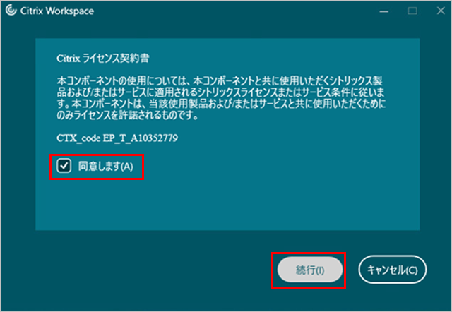 4. 「同意します」にチェックを入れ、「続行」をクリックします。