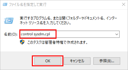 ※WindowsキーとRキーを同時に押して「ファイル名を指定して実行」を開き、名前に「control sysdm.cpl」と入力して実行します。