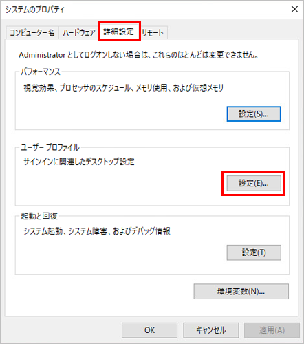 3. 「詳細設定」タブを選択し、「ユーザー プロファイル」の「設定」をクリックします。