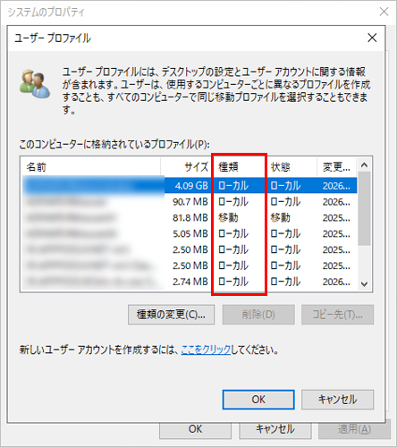 4. 「種類」に表示されるのがユーザープロファイルの種類になります。