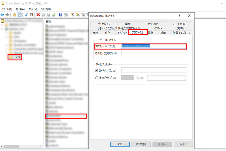 保存先については、ADサーバーから「Active Directory ユーザーとコンピューター」から対象ユーザーのプロパティを開き、「プロファイル」タブよりパスを確認します。