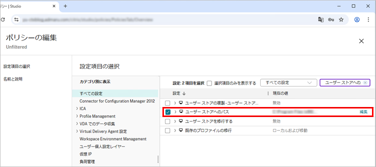 保存先は、Citrix Studioからポリシー設定を開き、「ユーザー ストアへのパス」の項目から確認します。