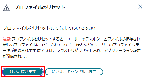 4. 「はい。続けます」をクリックします。プロファイルがリセットされます。
