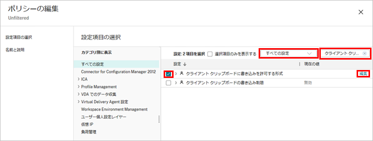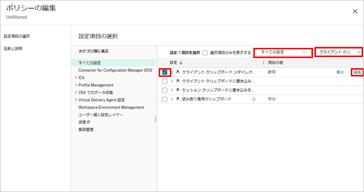 セキュリティ要件などにより、コピー&ペーストを全面的に禁止したい場合や、ローカルから仮想環境へのコピーのみを許可し、データの持ち出し(仮想環境からローカルへのコピー)を禁止したい場合は、Citrixポリシーを利用してクリップボードの動作を細かく制御できます。