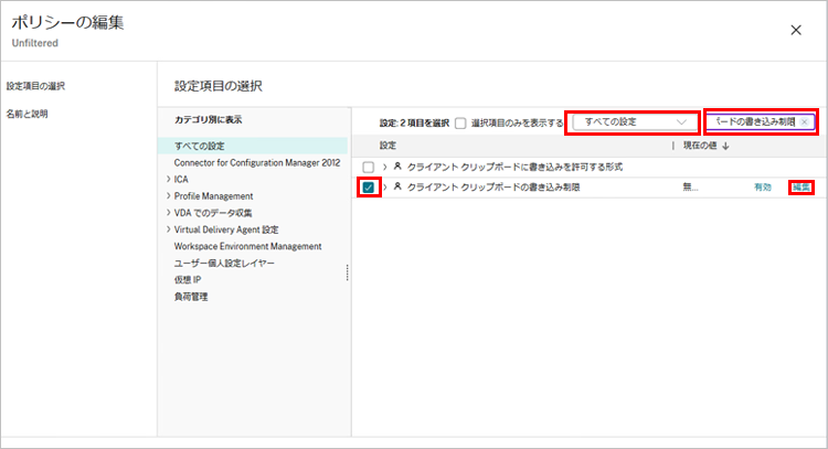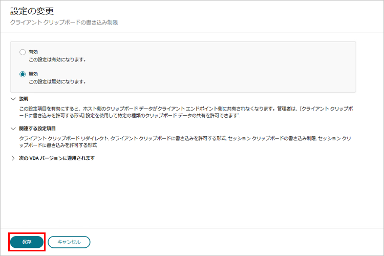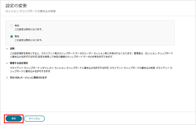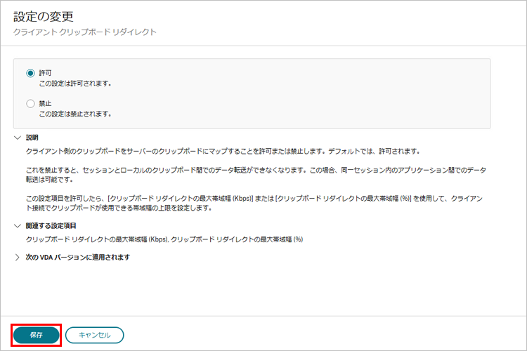 ※Web Studioでポリシーを保存した後、仮想マシン(VDA)に設定が同期されるまで数分〜10分程度のタイムラグが発生する場合があります。設定直後に再接続しても古いポリシーのまま動作してしまうことがあるため、設定保存後、少し時間を置いてから動作確認を行ってください。