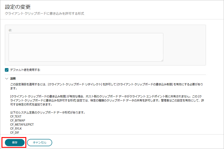 | クライアント クリップボードに書き込みを許可する形式 | CF_TEXTを指定 |