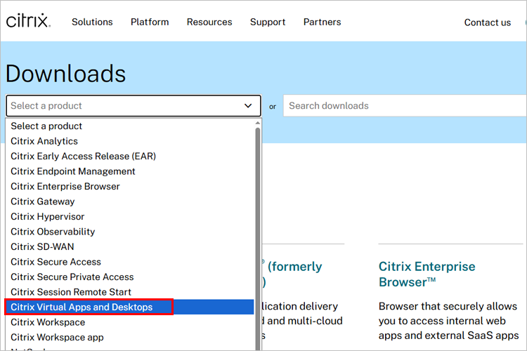 4. プルダウンメニューから「Citrix Virtual Apps and Desktops」をクリックします。