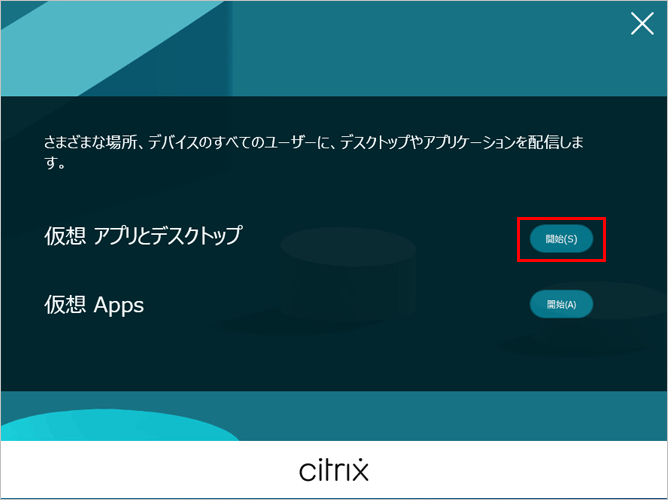 以下の画面が表示された場合は、「仮想 アプリとデスクトップ」あるいは「仮想 Apps」の箇所に表示されている「開始」をクリックします(どちらをクリックしても同じ画面に遷移します)。