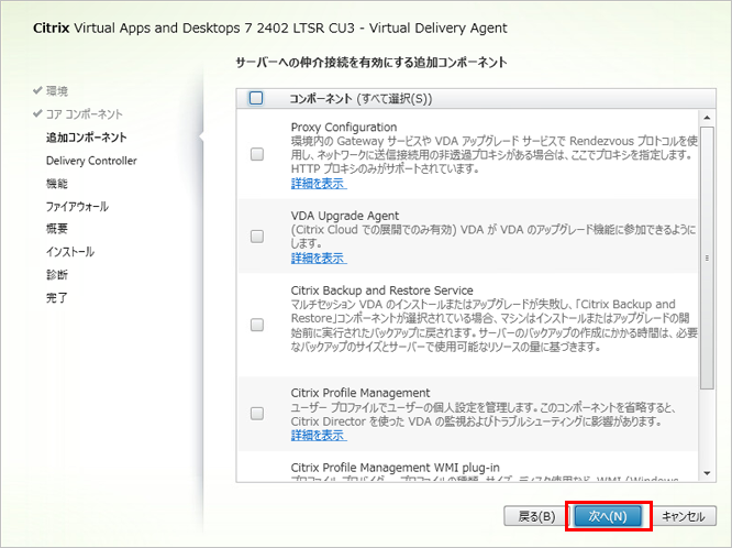※「Citrix Profile Management」と「Citrix Profile Management WMI Plug-in」にチェックをつけない場合、Citrix DirectorからVDAサーバーの監視およびトラブルシューティングに影響があります。