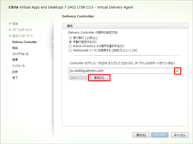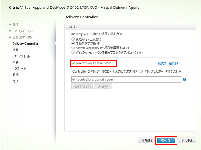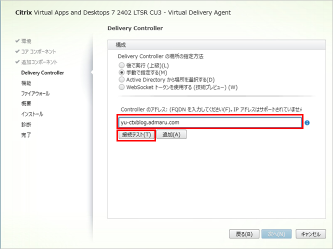 6. 「Delivery Controllerの場所の指定方法」は、デフォルトの「手動で指定する」のまま、デリバリーコントローラーサーバーのFQDNを指定して「接続テスト」をクリックします。