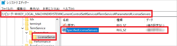 2. HKEY_LOCAL_MACHINE\SYSTEM\CurrentControlSet\Services\TermService\Parameters\LicenseServersのSpecifiedLicenseServers にて、設定した値が表示されることを確認します。