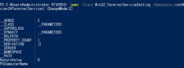 (gwmi -Class Win32_TerminalServiceSetting -Namespace root\cimv2\TerminalServices).ChangeMode(2 もしくは 4)