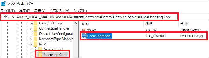 4. HKEY_LOCAL_MACHINE\SYSTEM\CurrentControlSet\Control\Terminal Server\RCM\Licensing Core\LicensingMode にて、指定した値が表示されることを確認します。本記事は2が表示されています。