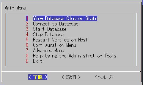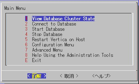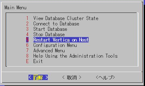 $ admintools2) [Administration Tools] の画面が表示されるので、[5 Restart Vertica on Host] を選択後、[了解] を選択します。