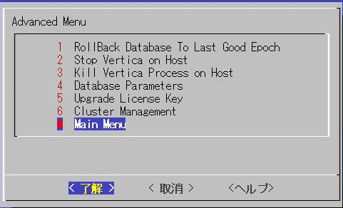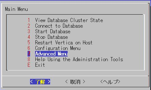 $ admintools2) [Administration Tools] の画面が表示されるので、[7 Advanced Menu] を選択後、[了解] を選択します。