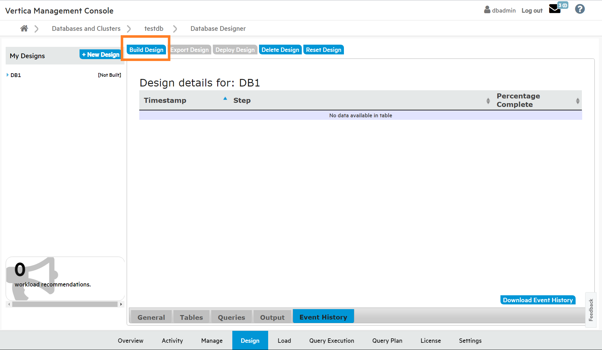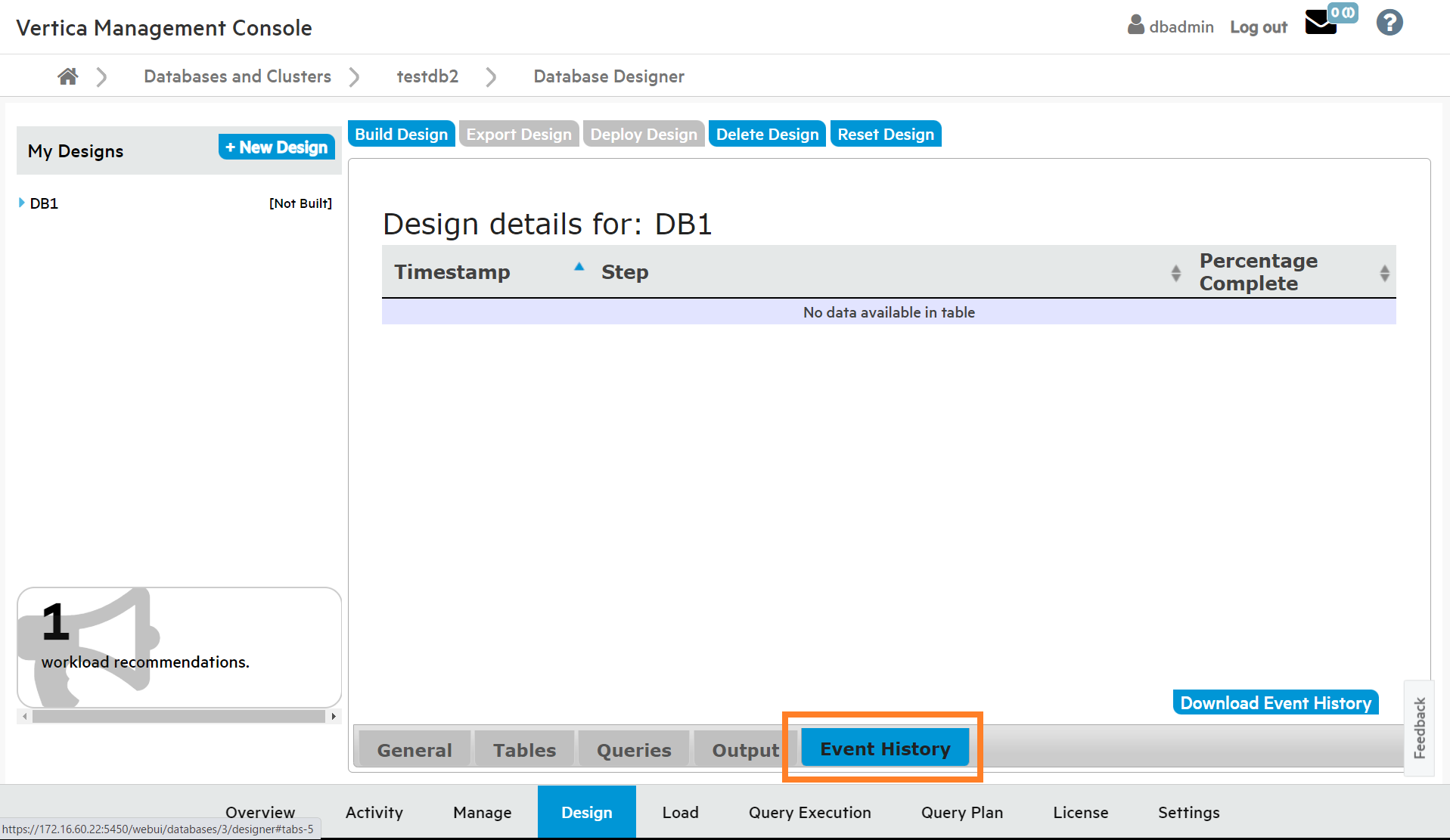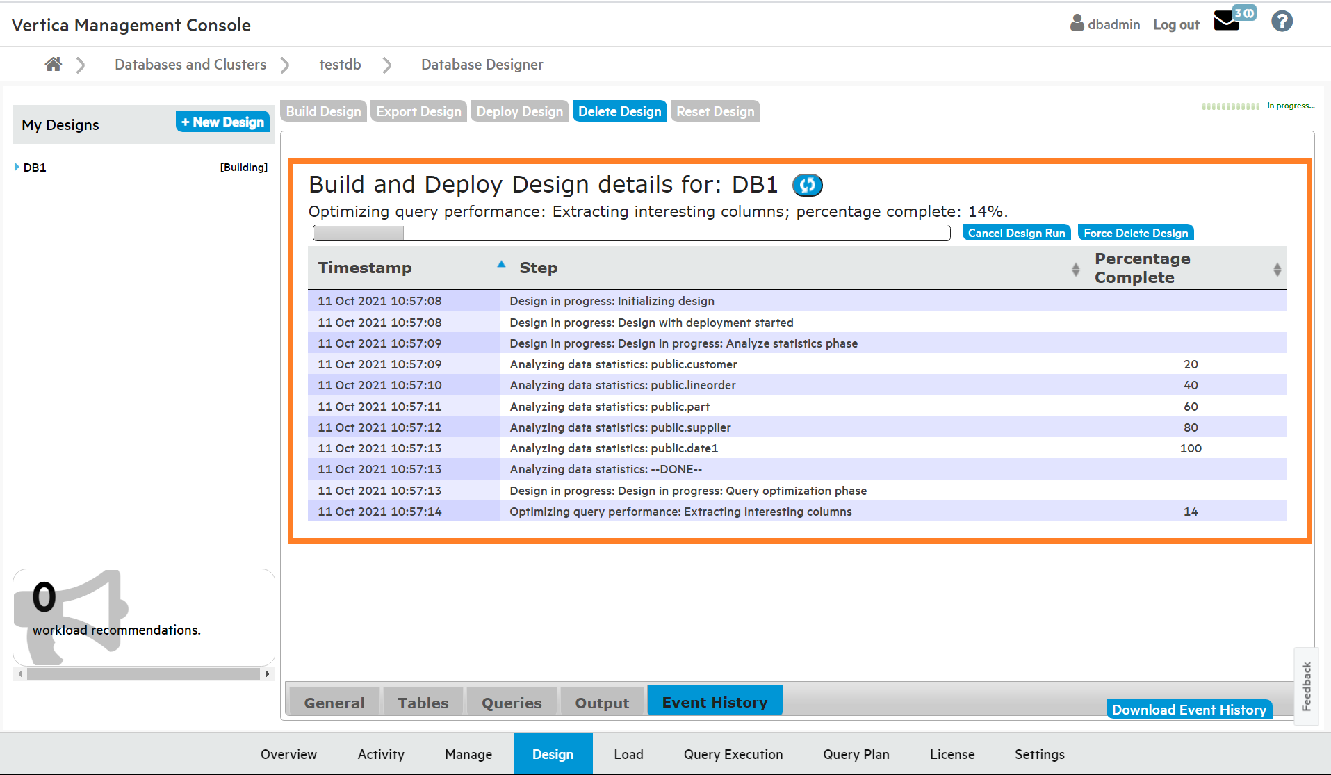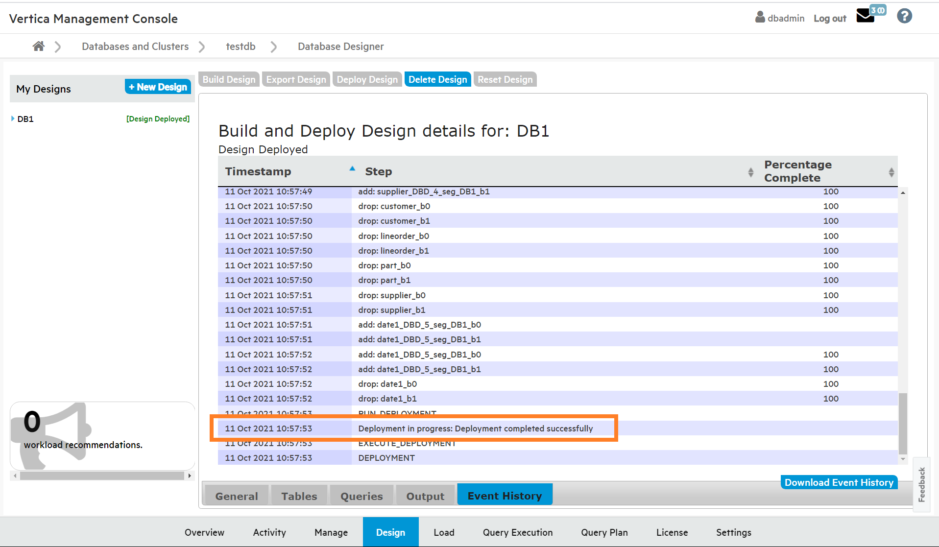 Event Historyタブの画面に、Database Designer実行時のイベントログが表示されます。