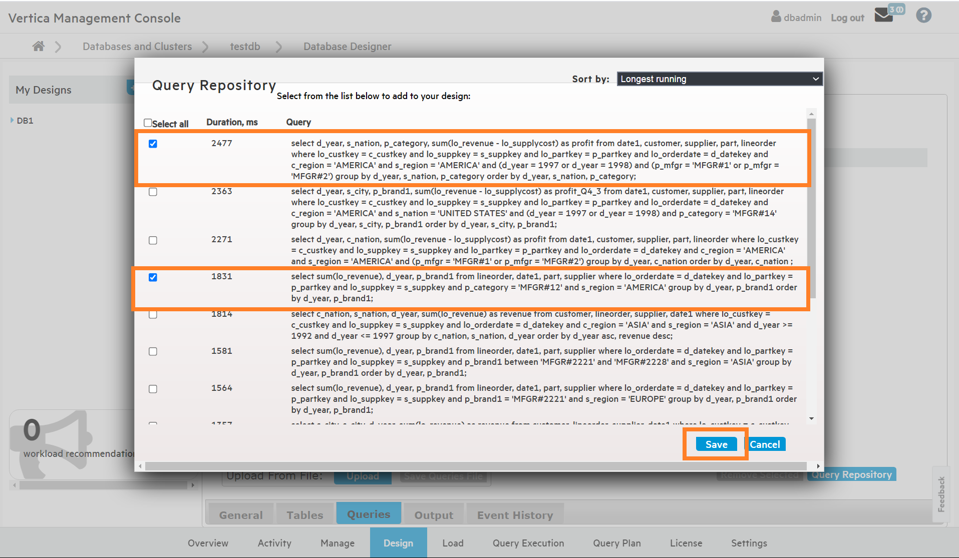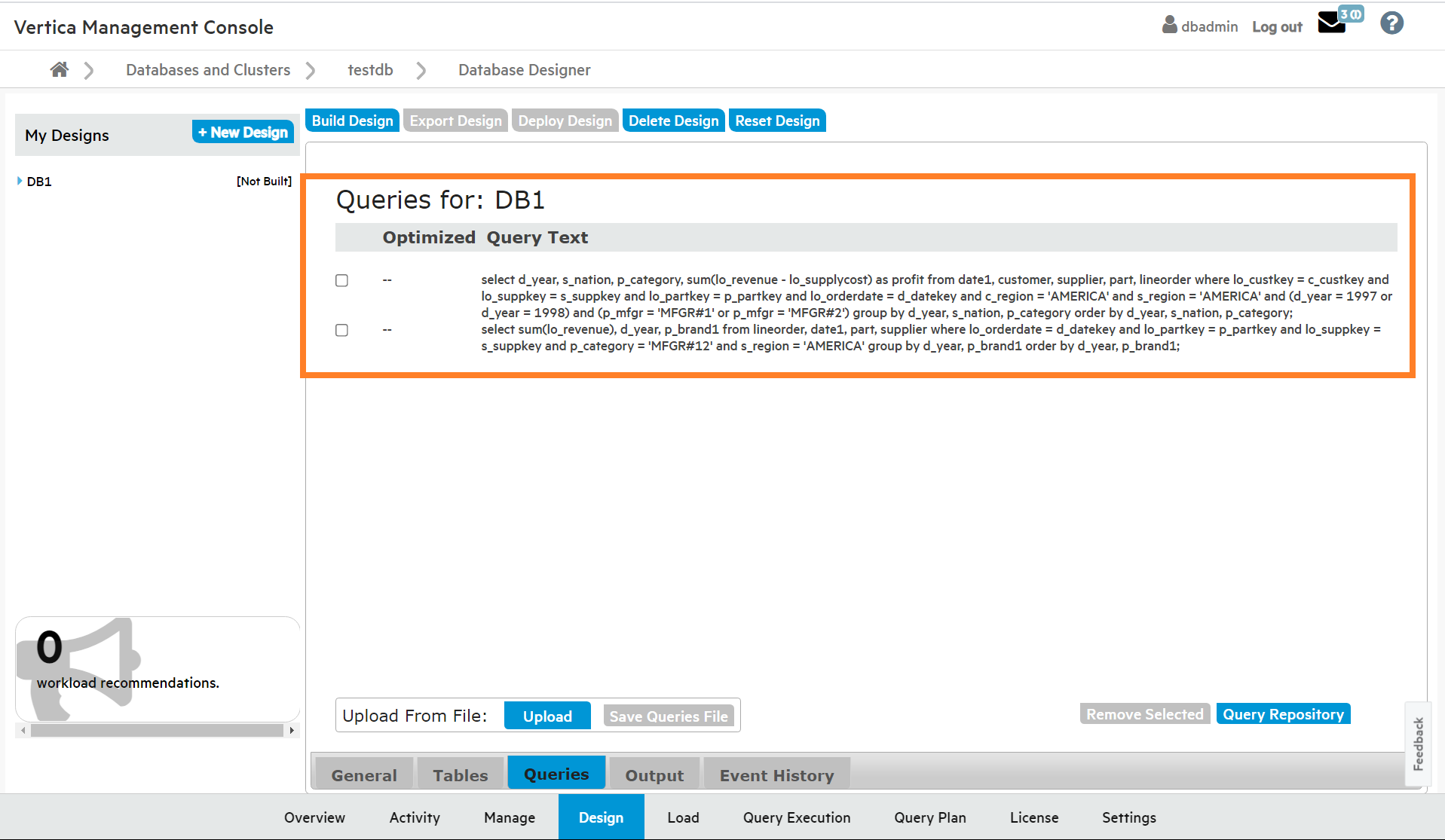 「Comprehensive」モードでは、クエリを読み込ませる事で最適化スーパープロジェクションの他に補助的なクエリスペシフィックプロジェクションが作成されます。この設定は必須ではありませんのでスキップしても構いません。クエリを読み込ませない場合は、テーブルデータを元に最適化されます。