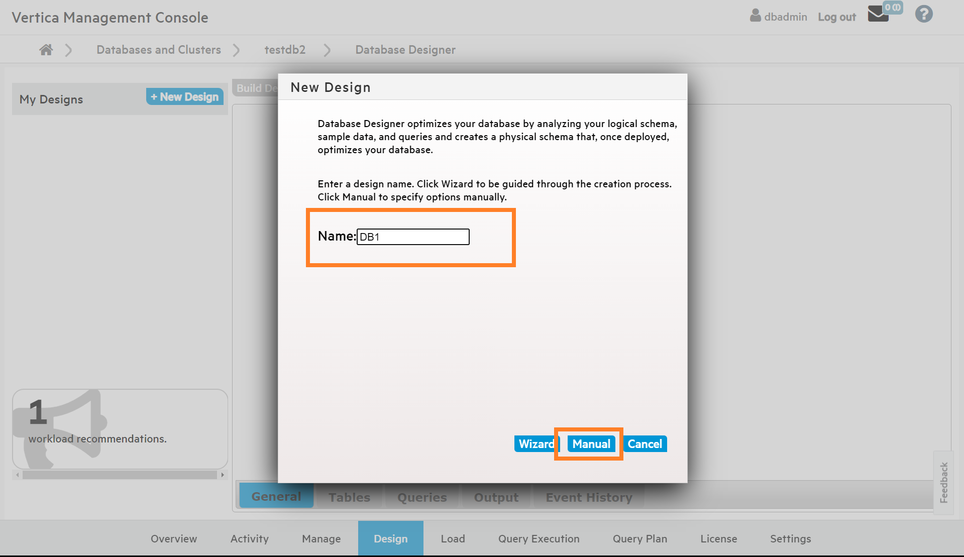 ここでは「Wizard」か「Manual」を選択して先に進みます。今回はデータベースデザインの名前を「DB1」と入力し、「Manual」を選択します。