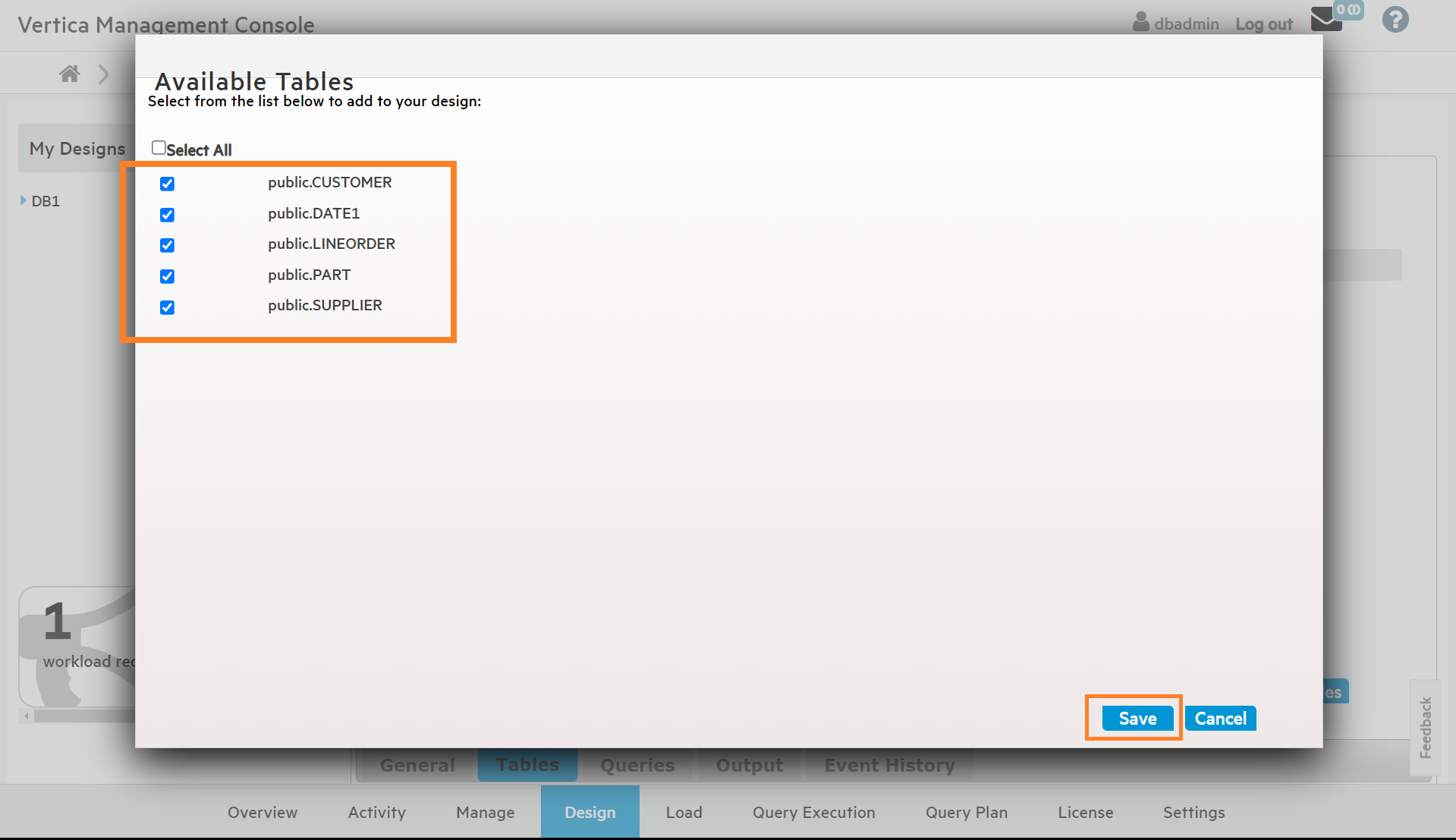 表示されたポップアップ・ウィンドウから、プロジェクション作成の対象となるテーブルを選択し、「Save」をクリックします。