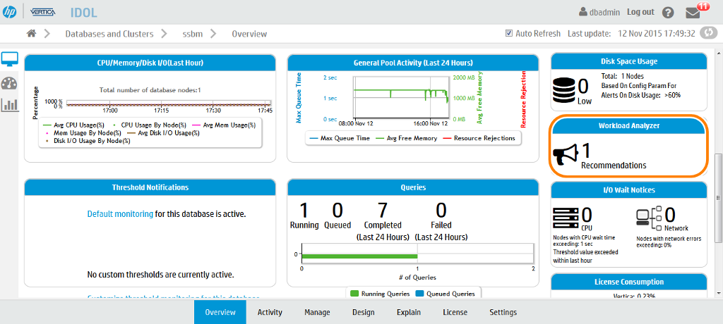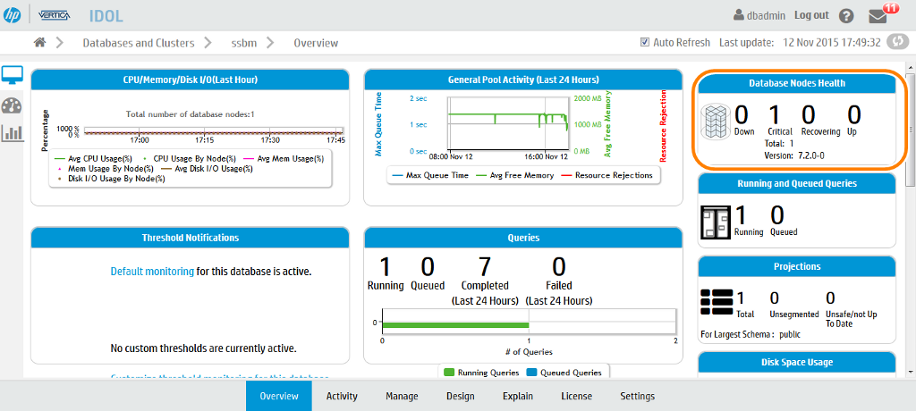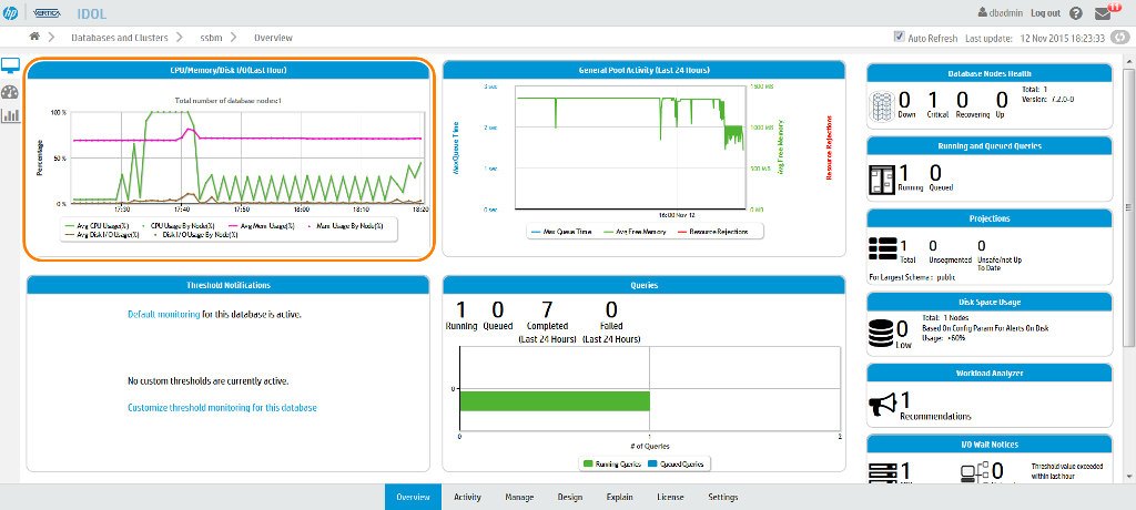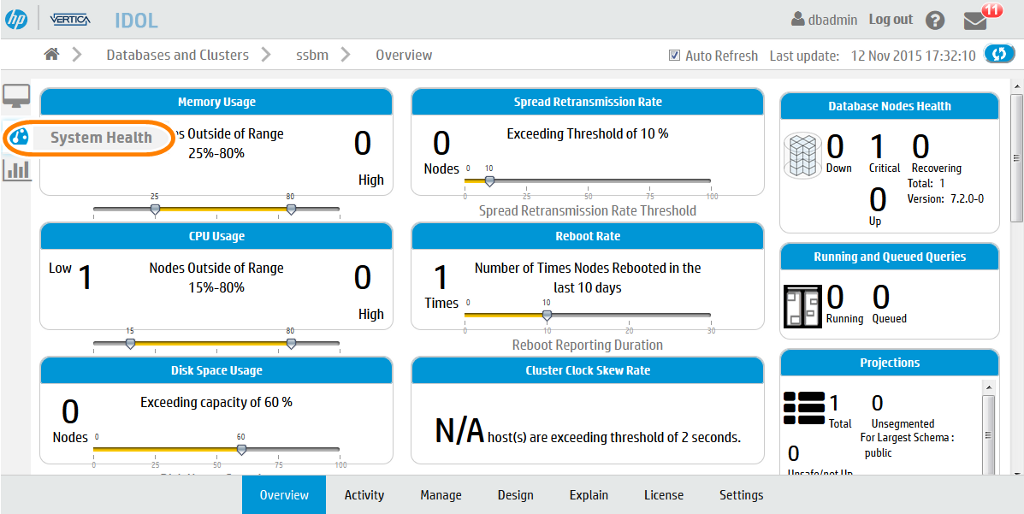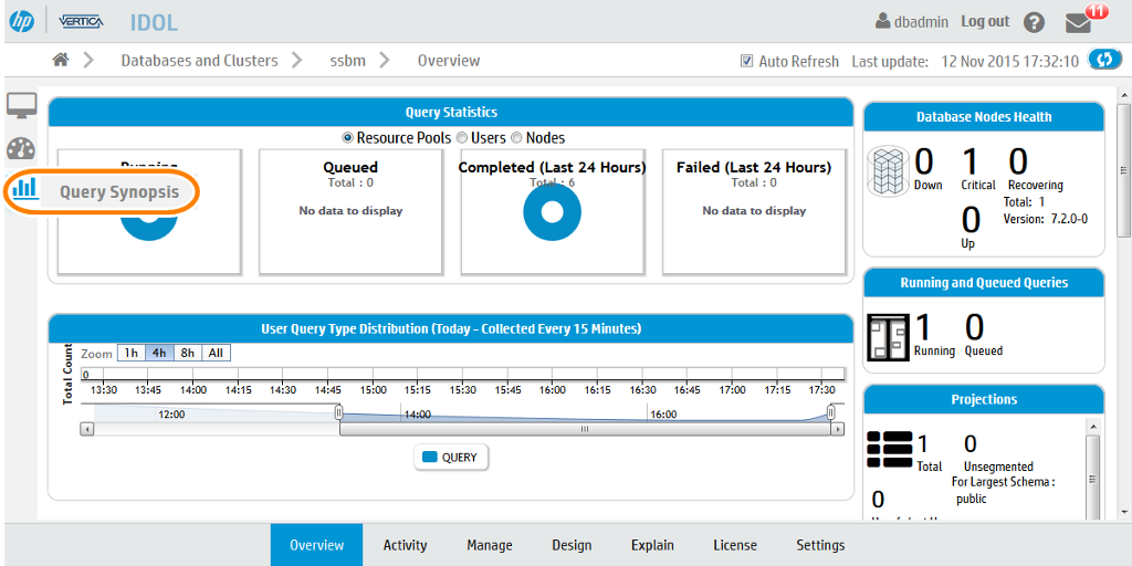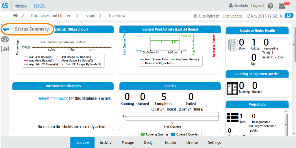 ダッシュボードのページには3つのタブ(Status Summary、System Health、Query Synopsis)が構成されていて、ページ左側に位置するタブで切り替えができます。