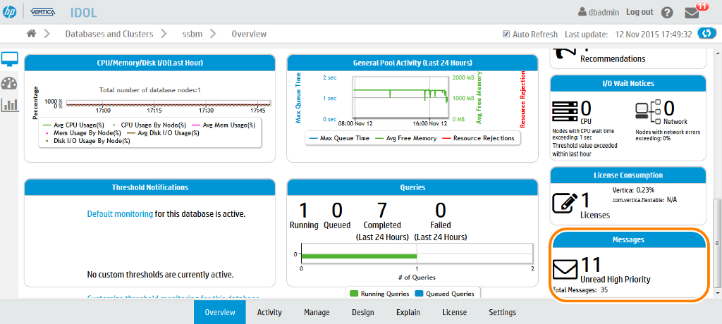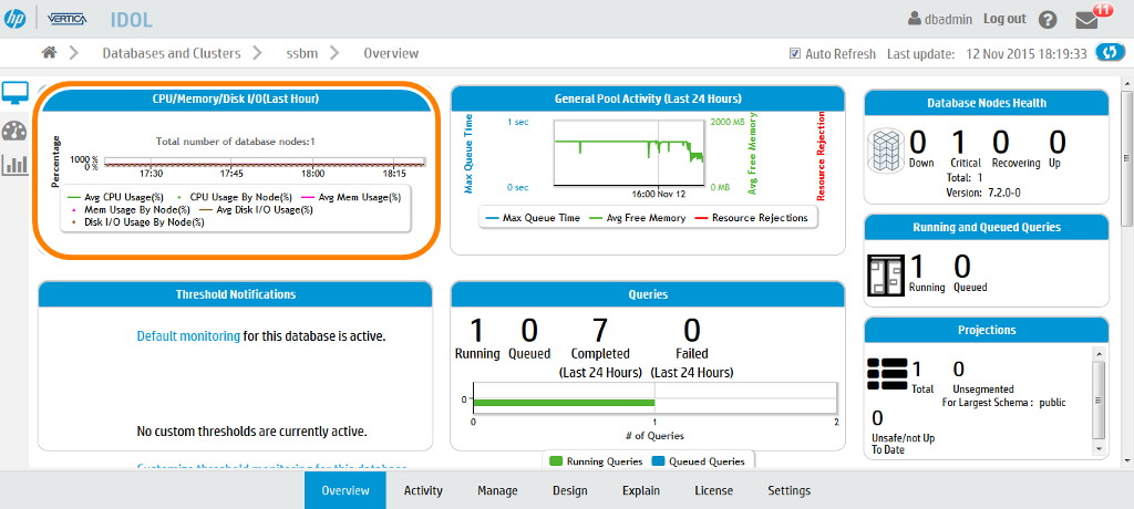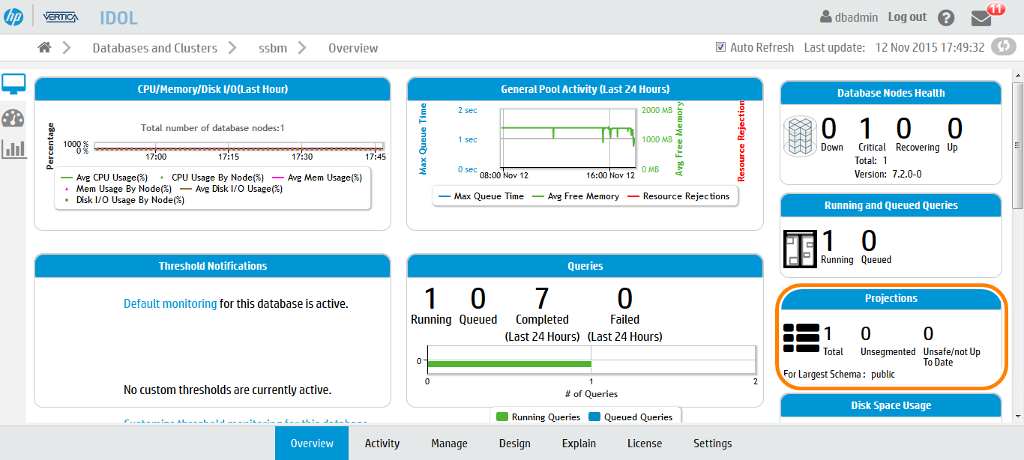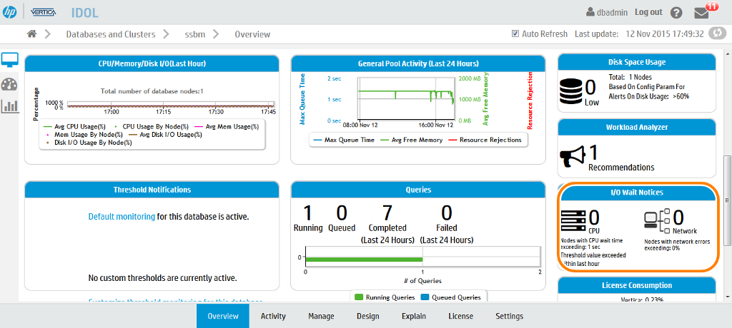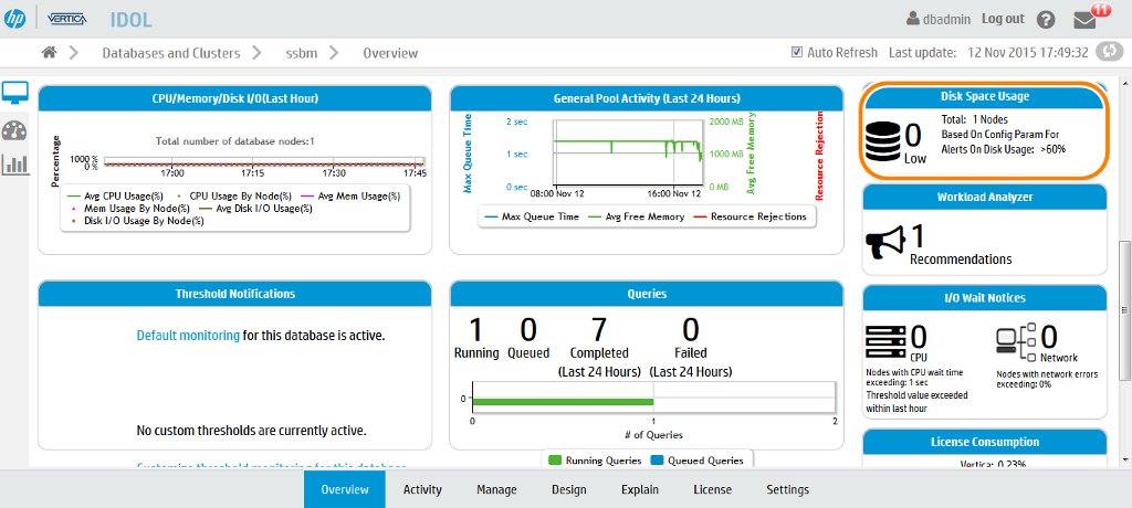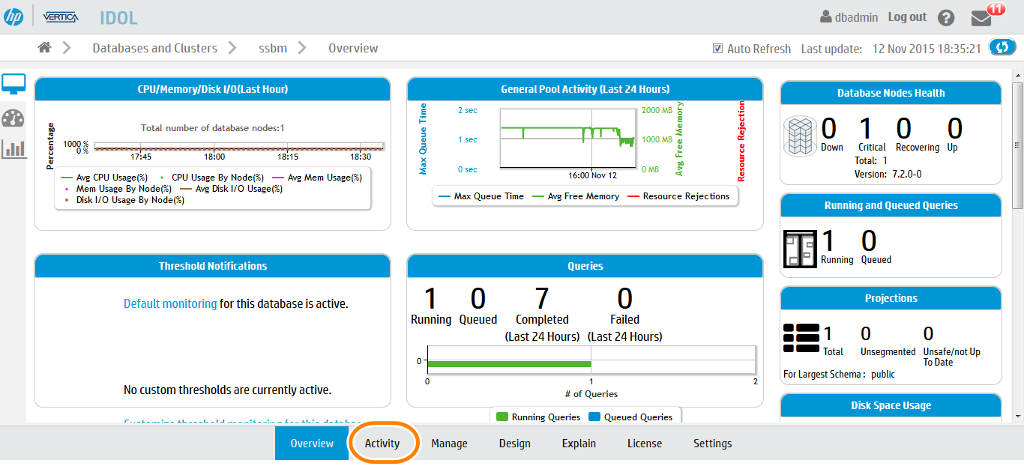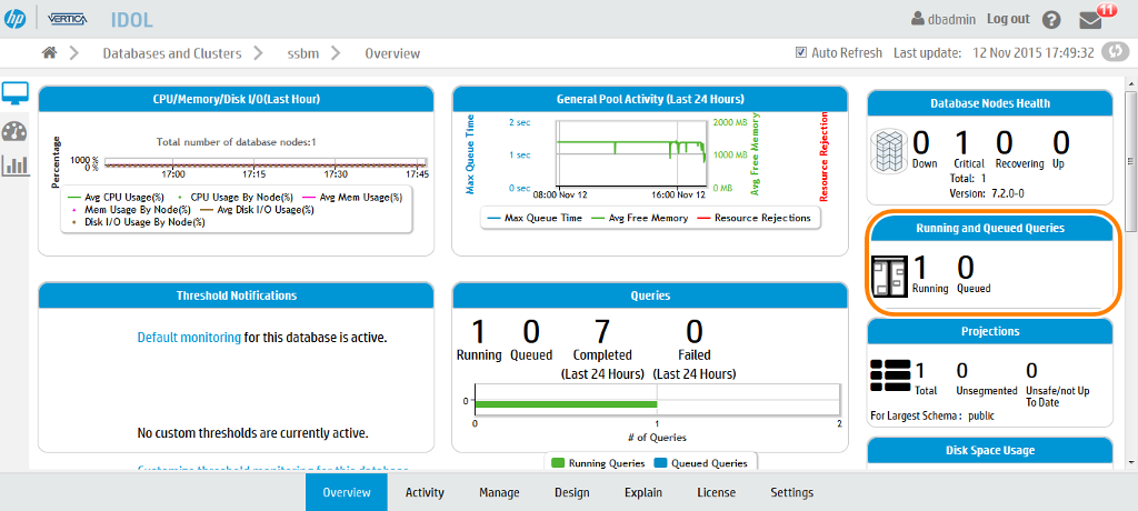 ダッシュボードのページには3つのタブ(Status Summary、System Health、Query Synopsis)が構成されていて、ページ左側に位置するタブで切り替えができます。