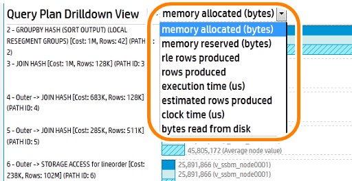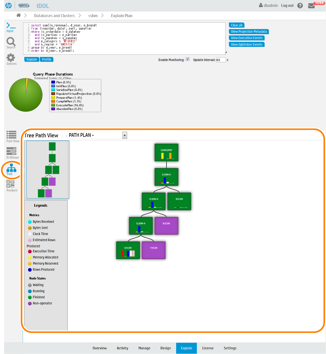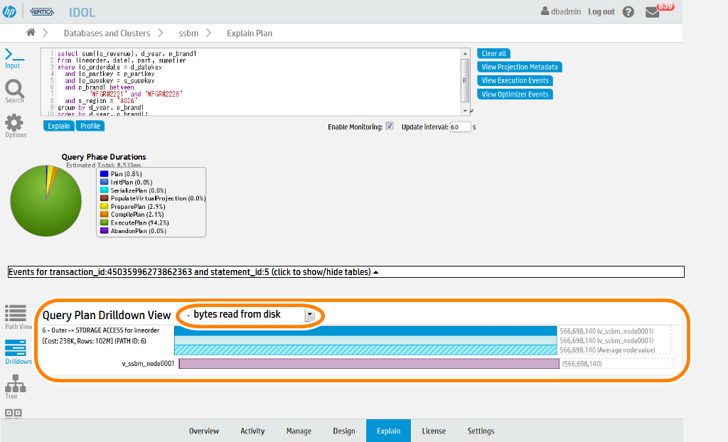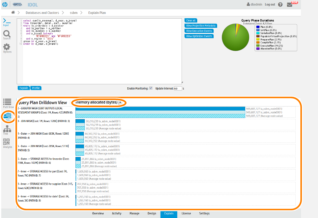 Path Informationの表示では、先程のExplainで表示された内容と同じ実行計画が表示されますが、右側には長方形のバロメーターが表示されます。これらは「Disk」と「Memory」ではディスクとメモリのリソース使用量、「Sent」と「Recieved」ではクラスタ間で発生したデータ転送量(送受信量)、そして「Time」ではそのステップの所要時間を表わすバロメーターが表示されています。