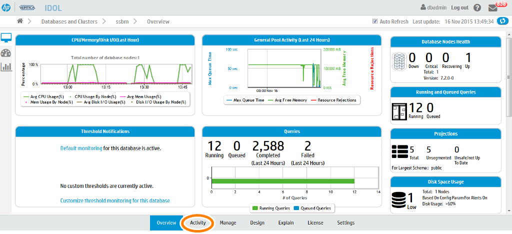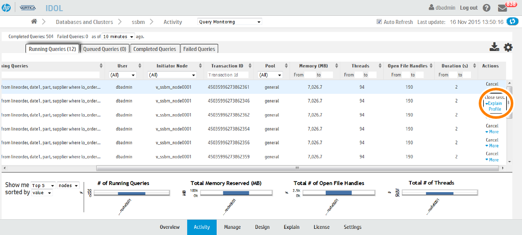 ※今回のVerticaサーバはシングル構成のため1台分しか表示されていませんが、クラスタ内の複数ノードがどれくらいの分散処理をしたかを確認したいケースで使えます。
