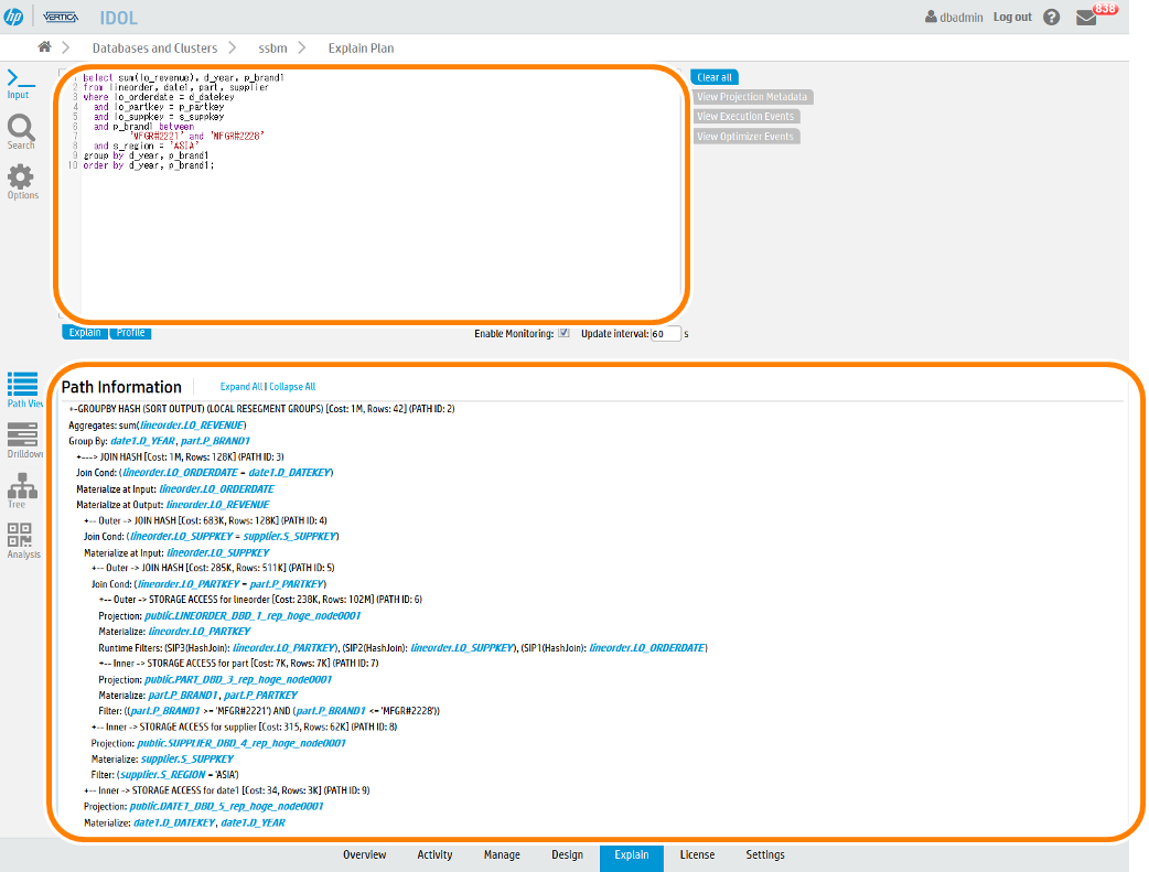 「Explain」をクリックすると、上段にはクエリのSQL文、下段にはPath Informationが表示されます。