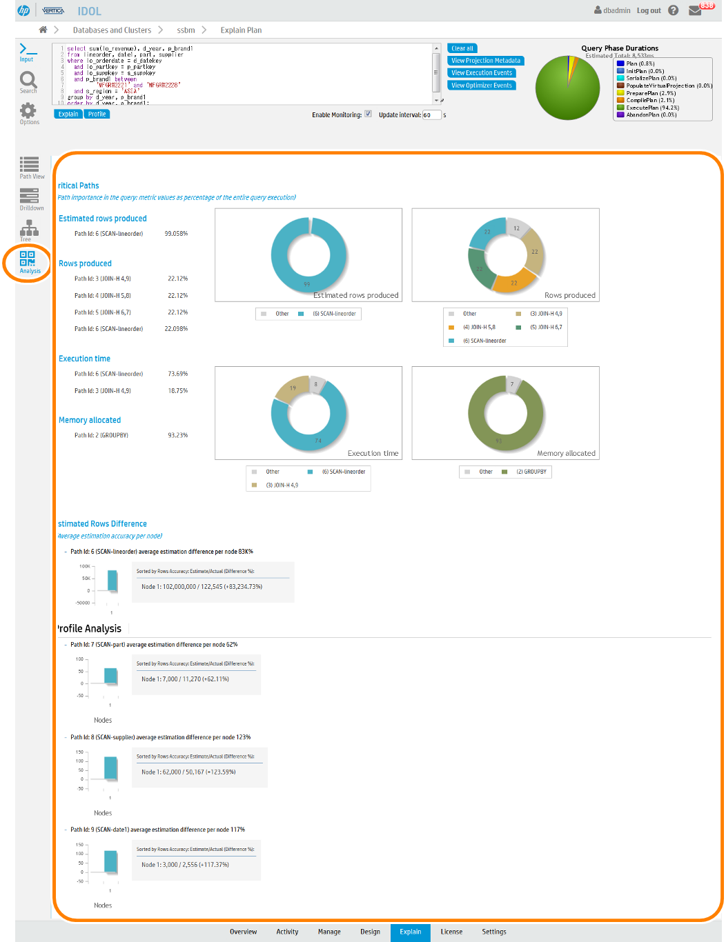 「Profile」をクリックすると、上段左側にはクエリのSQL文、上段右側にはクエリ処理における各フェーズごとの所要時間の割合を示した円グラフ、下段にPath Informationが表示されます。