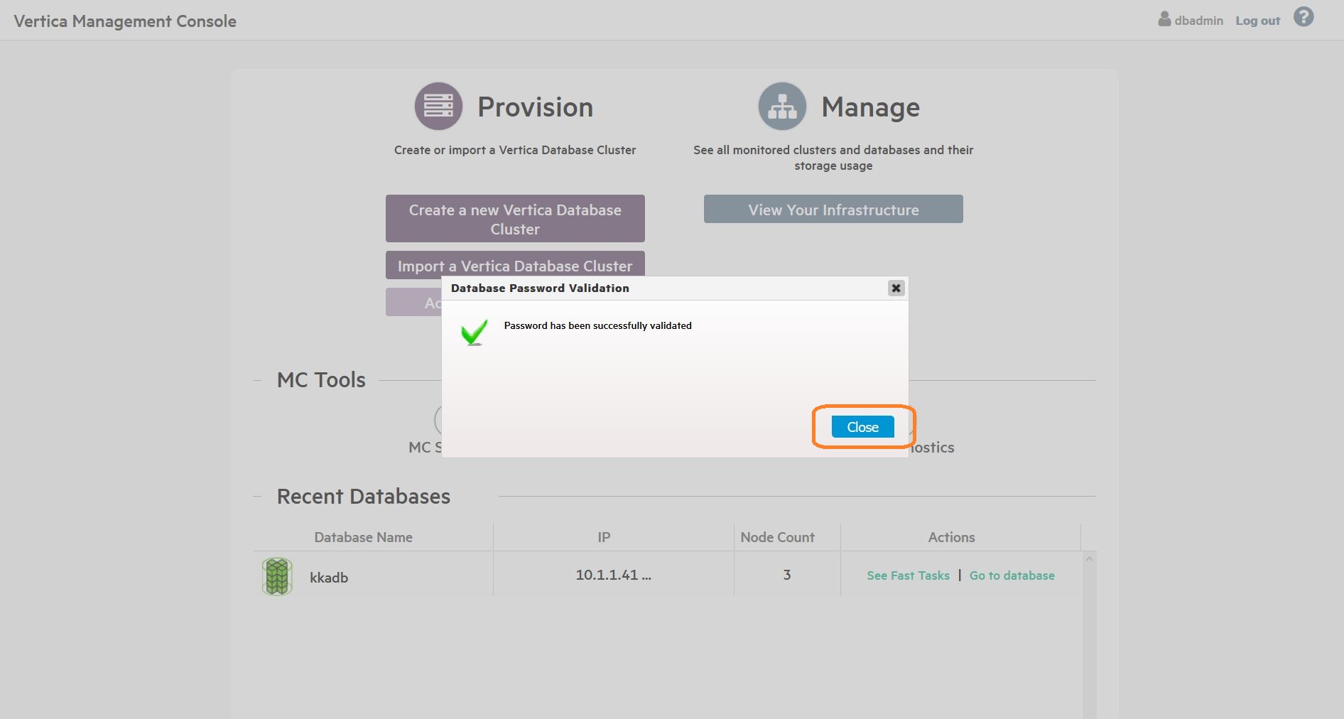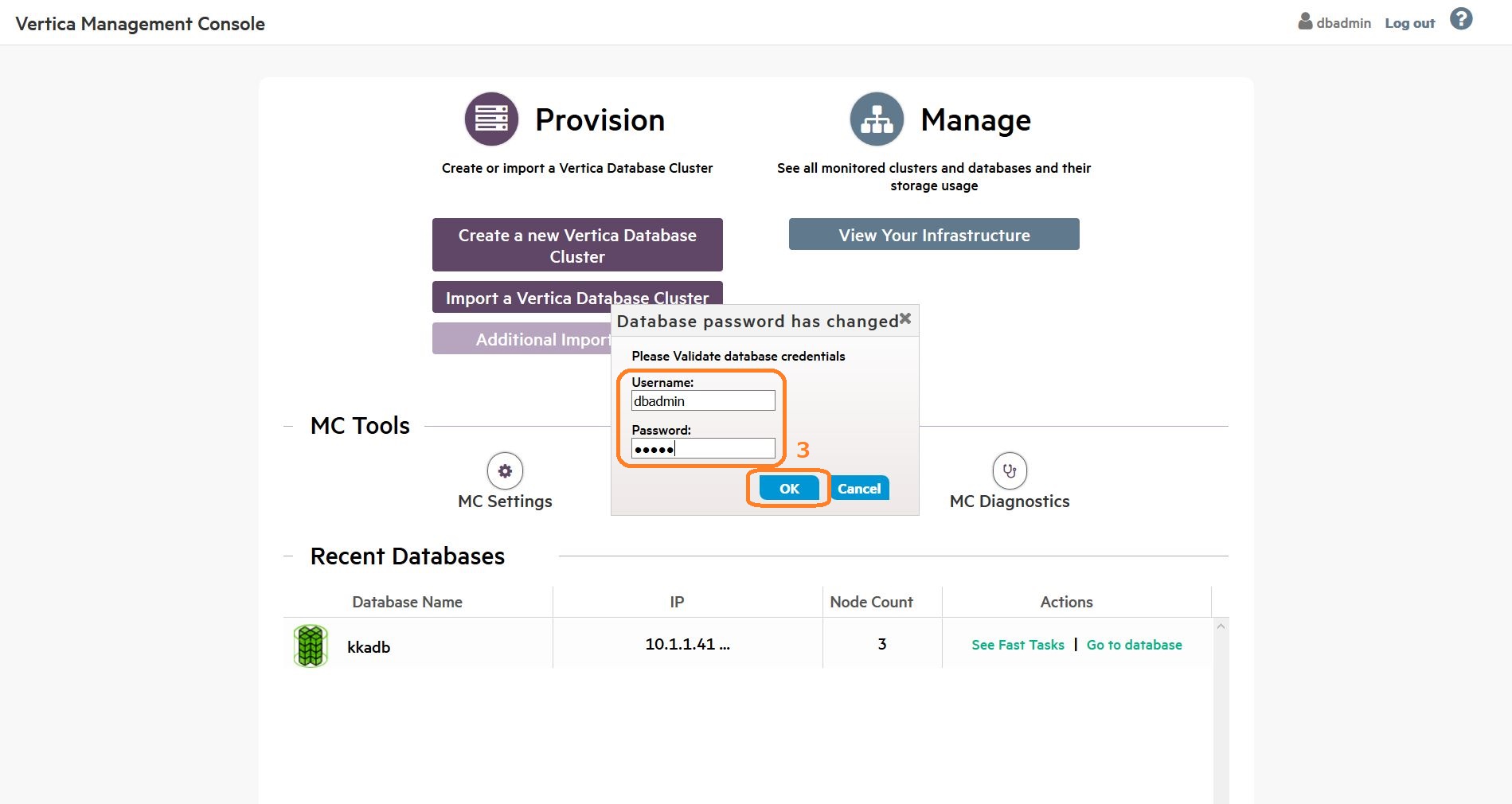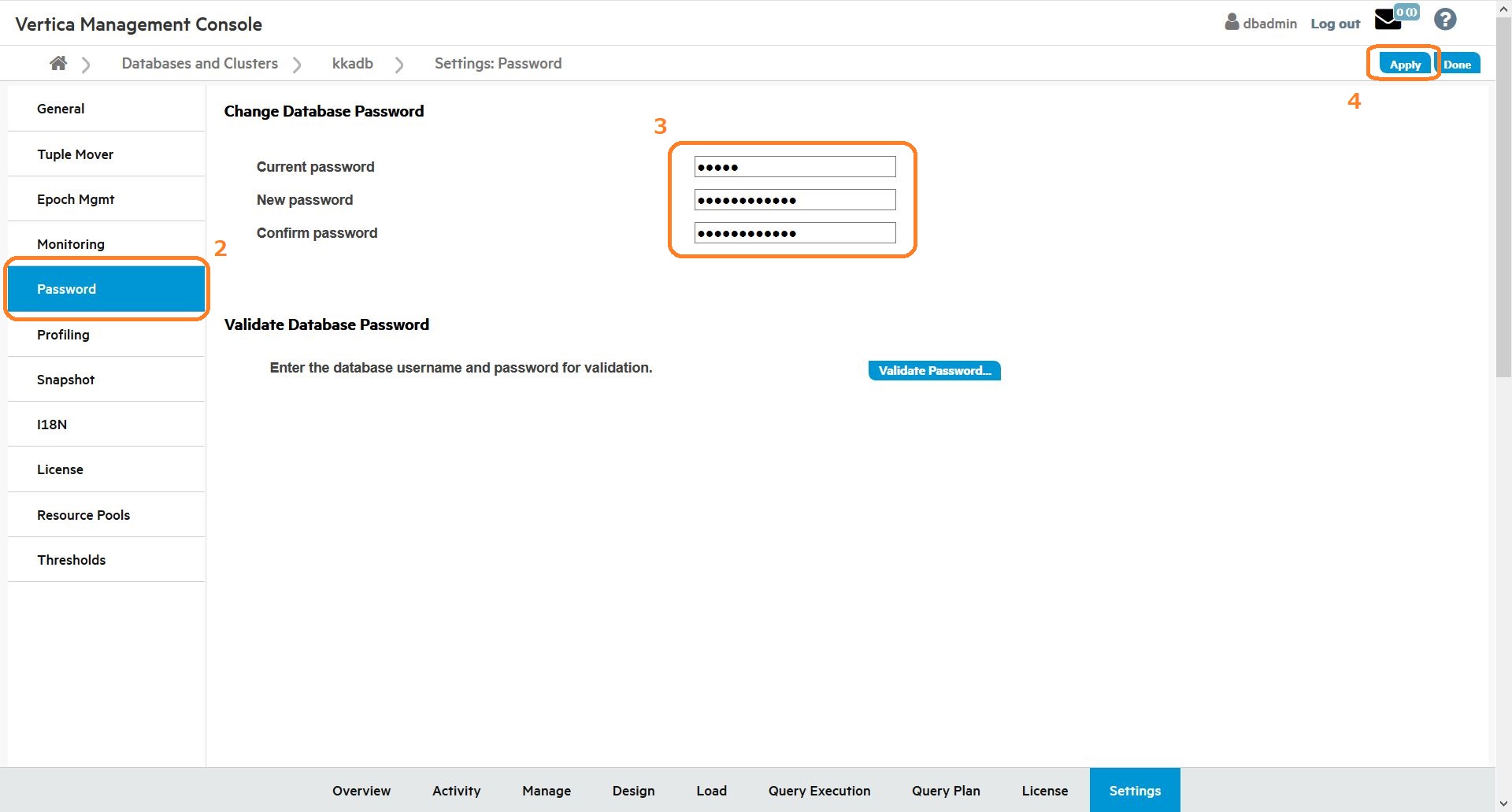 dbadmin=> ALTER USER dbadmin IDENTIFIED BY ’new-password’;