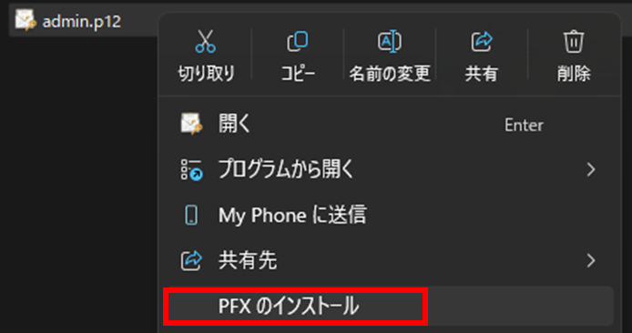 ダウンロードしたクライアント証明書を右クリックで選択し、「PFXのインストール」をクリックします。