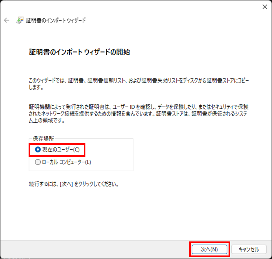 「現在のユーザー(C)」が選択されていること確認し、「次へ」をクリックします。