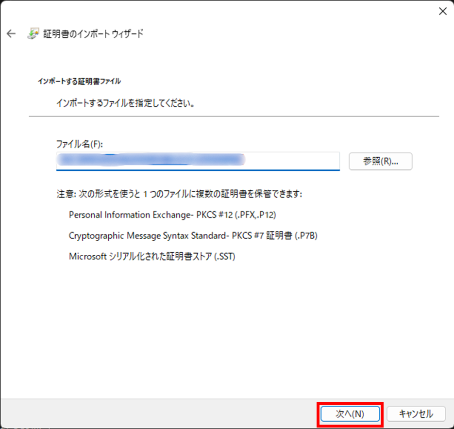 先程ダウンロードした証明書ファイルを指定し、「次へ」をクリックします。
