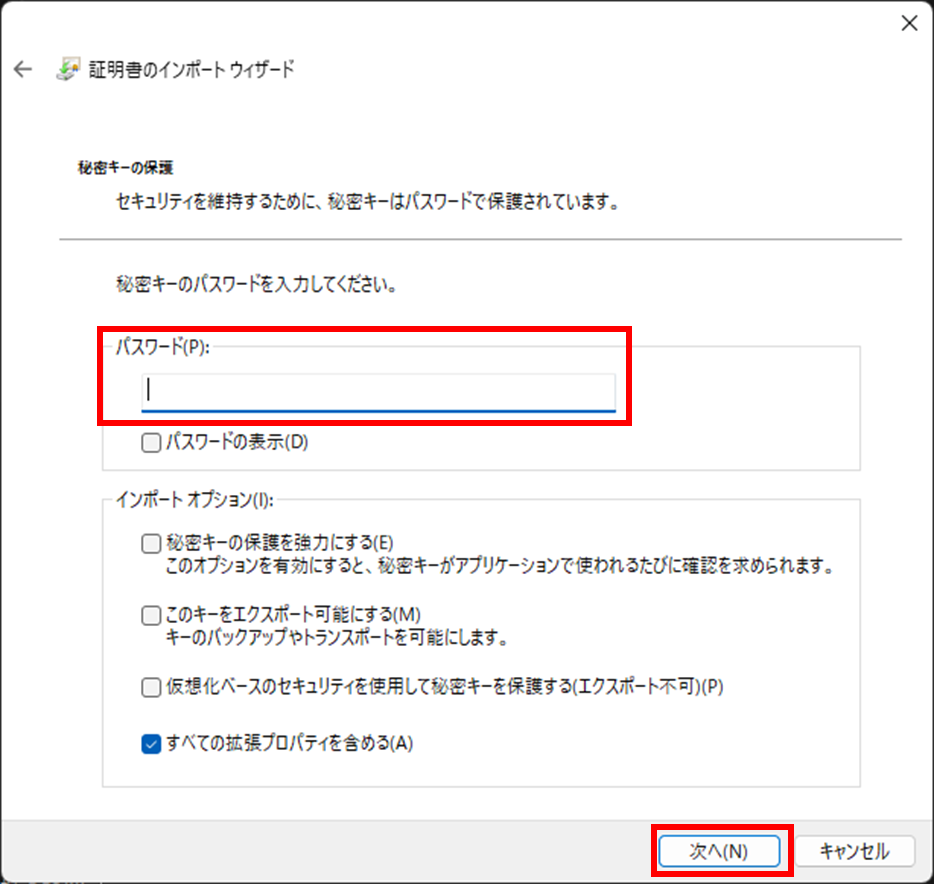 証明書作成時に指定したパスワードを入力し、「次へ」をクリックします。