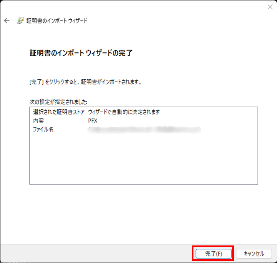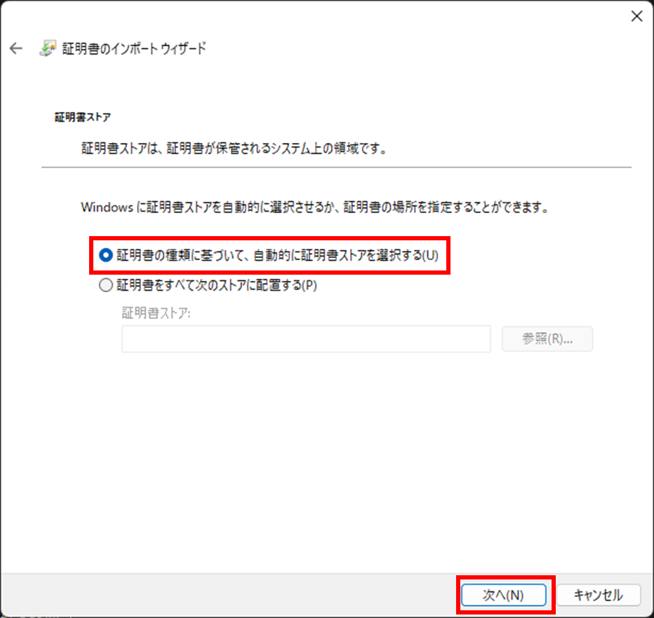 証明書ストアの配置先を指定し、「次へ」をクリックします。