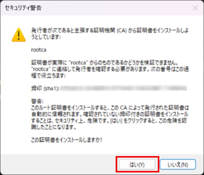 ※以下のセキュリティ警告が発生した場合、「はい」をクリックしてインポートを進めてください