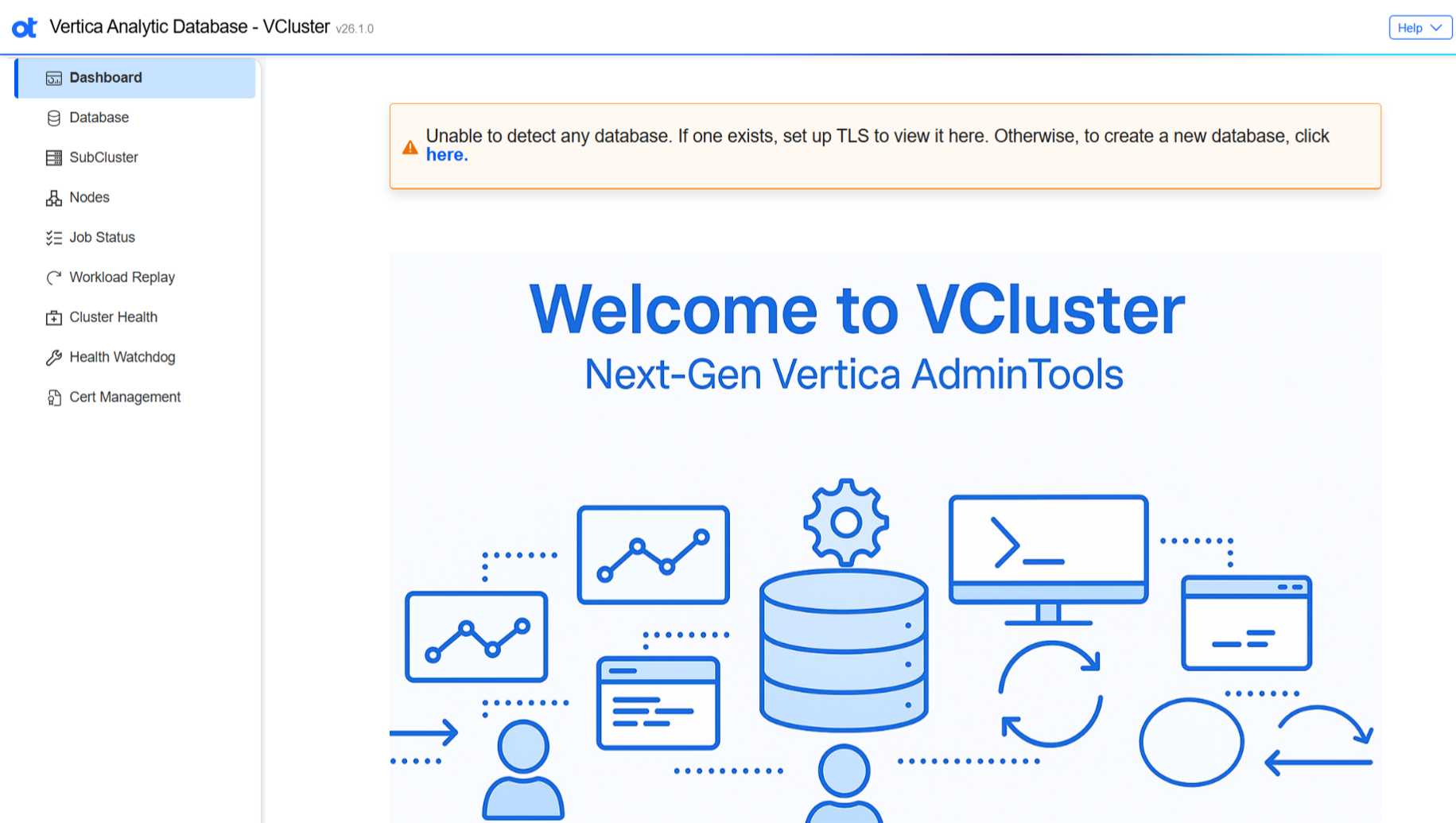VClusterは、OpenText Analytics Database(OTAD)におけるデータベースの作成、ノード管理、および起動・停止制御の機能を提供するWebベースのクラスタ管理ツールです。