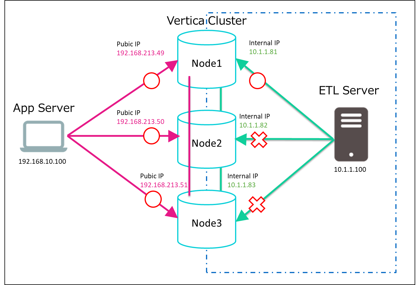 ・ETL処理が実行される内部ネットワーク(10.1.1.0/24)からの接続は、ノードIPアドレス10.1.1.81~10.1.1.83でロードバランスを行う