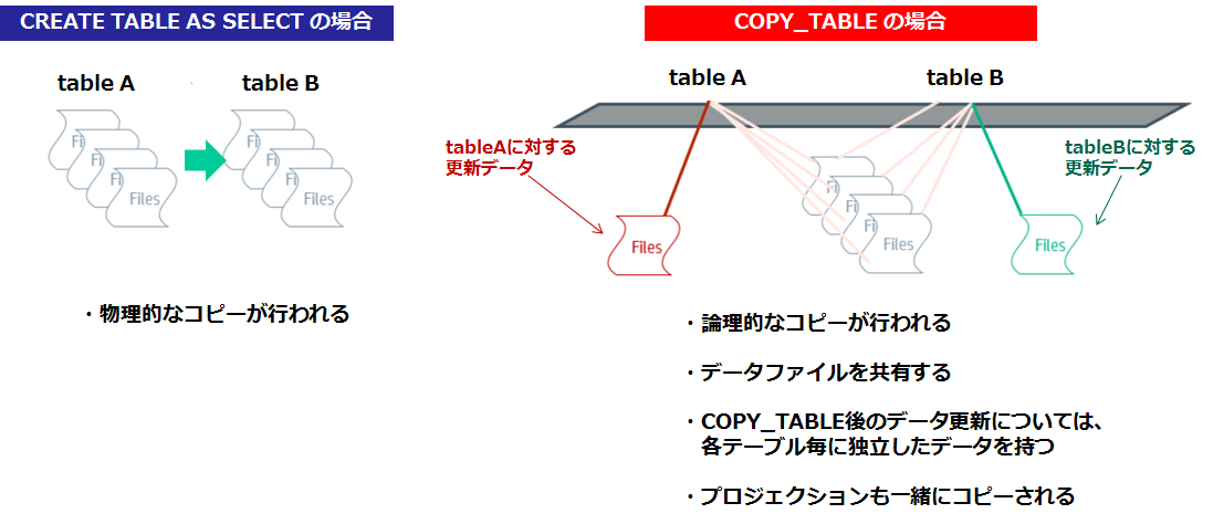 Verticaは既存のテーブルから新しいテーブルを作成する方法として、”COPY_TABLE” コマンドを利用することができます。論理的なコピーのため、”CREATE TABLE AS SELECT” と比較して高速です。