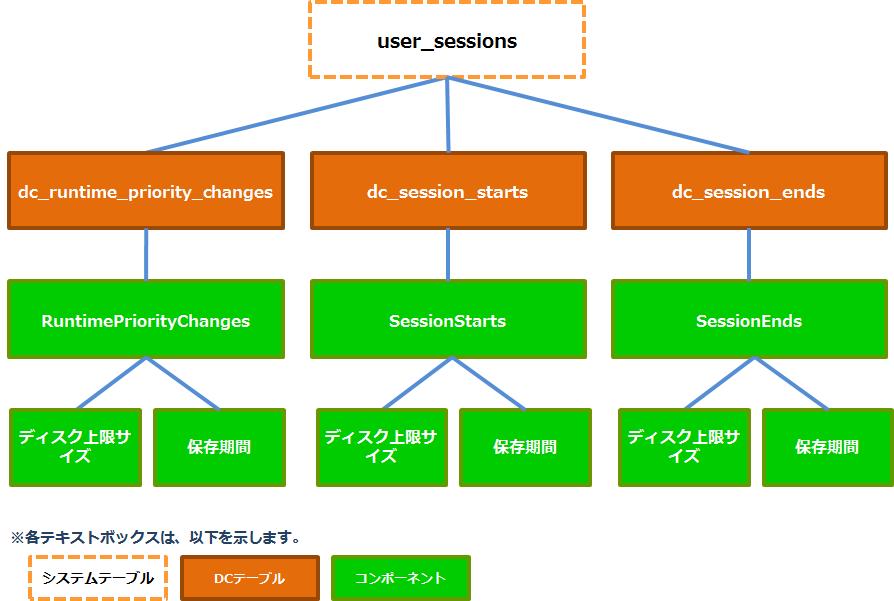 user_sessionsシステムテーブルは、dc_session_starts、dc_session_ends、dc_runtime_priority_changesで構成されています。