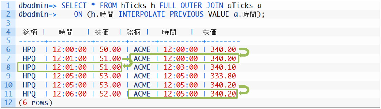 dbadmin-> ON (テーブル名Aの比較対象列 INTERPOLATE PREVIOUS VALUE テーブル名Aの比較対象列);※INTERPOLATE PREVIOUS VALUEがVertica拡張SQLの記述部分です。