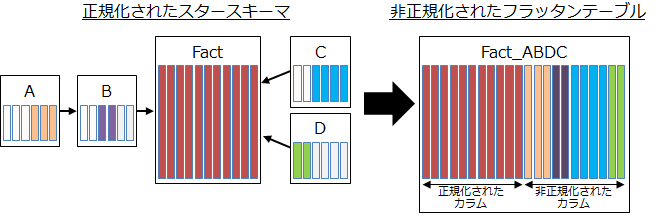 フラッタンテーブルとは、従来の正規化されたファクト表に非正規化列を追加したテーブルです。